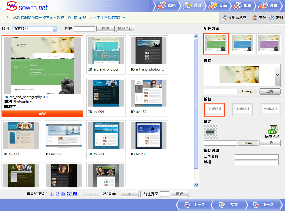 - 超過 400 款網頁設計範本 (Web Templates) 可供選擇, 每款樣本尚有多款顏色、 圖案可供使用。圖示