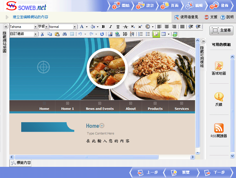 - 採用所見即所得網頁編輯器:只需會打字、選擇自己圖案檔案上載。圖示